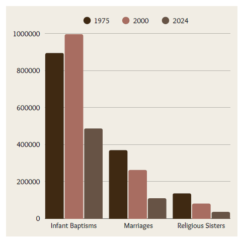 Vocations of all kinds have seen a drastic decrease in the Catholic Church. In addition to the number of seminarians decreasing over time, vocations to religious life AND sacramental marriages AND infant baptisms are in a freefall. This is particularly confusing because the number of registered Catholics in the U.S. is currently 67.3M-- an increase of 38% since 1975.